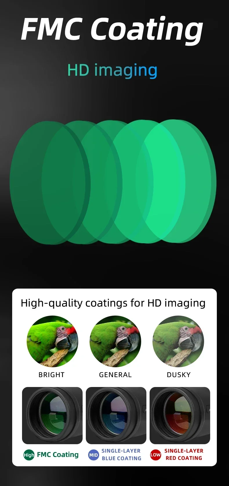 Kristalheldere optica: Met een objectieflens van 32 mm en een oculair van 15 mm, gecombineerd met FMC Green Broadband Coating op de objectieflens en Blue Coating op de oculairs, zorgt deze verrekijker voor levendige, high-definition beelden, zelfs op extreme afstanden.