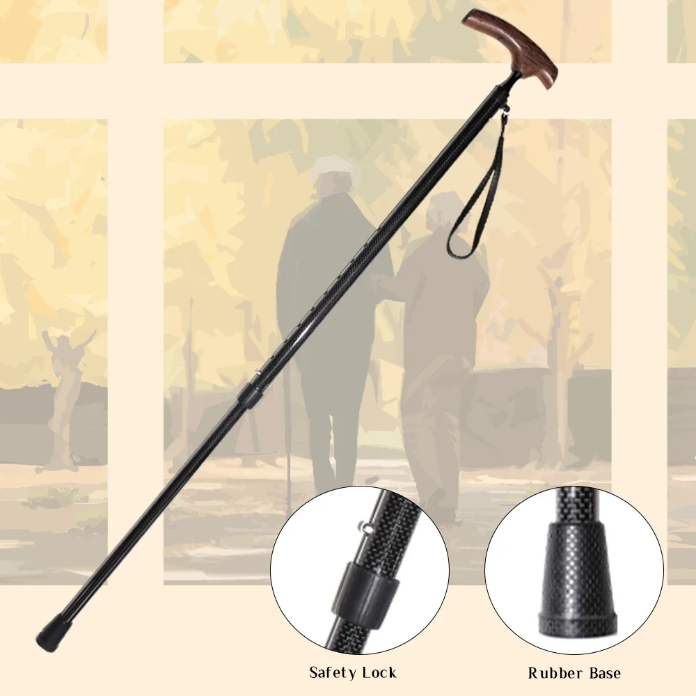 2024 Koolstofvezel wandelstok met wengéhouten handvat Sterke taaiheid Verstelbare lengte voor ouderen Rubberen basis