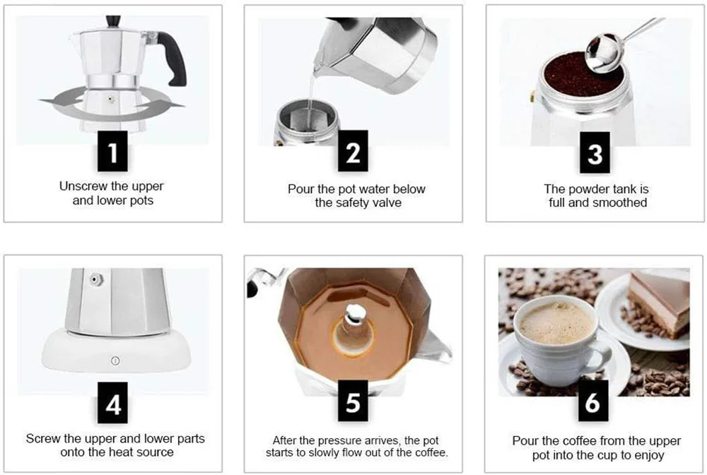3 GEMAKKELIJK TE GEBRUIKEN MET INSTRUCTIES: Voor het gebruik van de espressomachine van de kookplaat, draait u de bovenkant los en verwijdert u de filtertrechter van de bodem. Vul de bodem met zoet water tot het niveau van de veiligheidsklep en plaats de filtertrechter. Vul de filtertrechter met gemalen koffie (niet naar beneden drukken) en schroef de bovenkant stevig op de bodem. 3-5 minuten op middelhoog vuur, krijgt u het resultaat van rijke en hoogwaardige espresso koffie of Cafetera Cubana.
