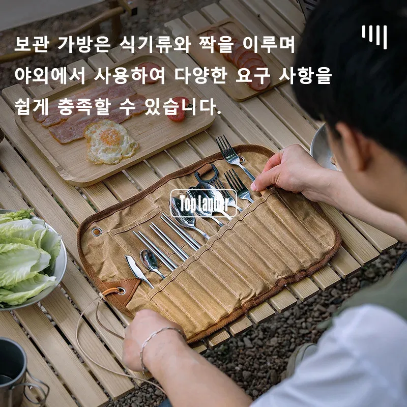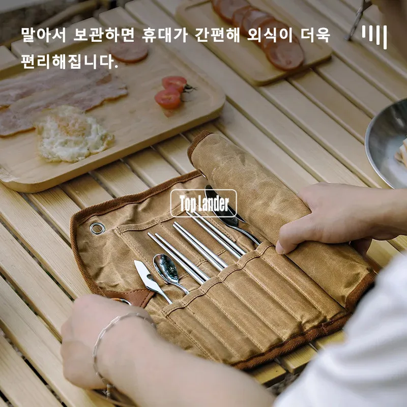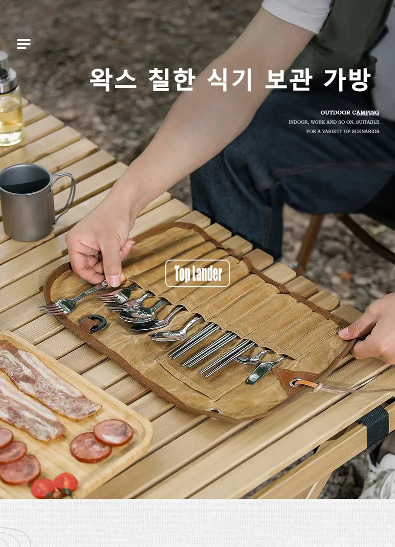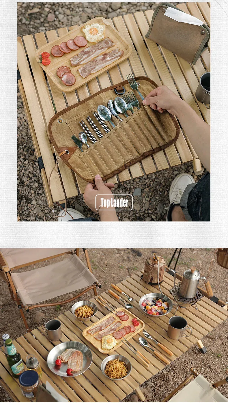 / Outdoor Waxed Canvas Tafelgerei Opbergtas Waterdicht Servies Set Rvs Lepel Eetstokjes Vork Camping Reizen Picknick