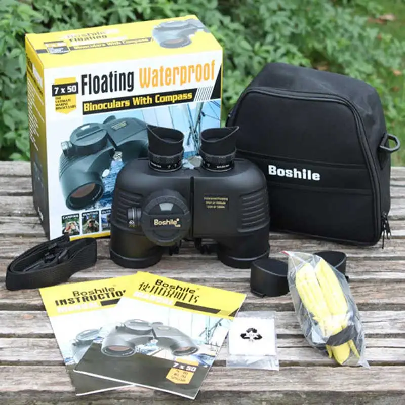 Marine binocular with 7x magnification and 50mm objective lens,22 mm long eye relief,6.8mm exit pupil, and field of view is 396 feet at 1000 yards.
